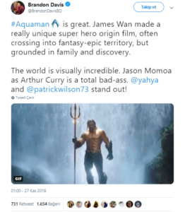 Bunun için biraz tepki çekeceğim ama Aquaman, DC’nin yaptığı en iyi Marvel filmi. Tamamen o formülü takip ettiği anlamına gelmiyor ama film, ne olduğunu, ne sattığını ve kime sattığını biliyor gibi duruyor. Bir kimlik bunalımı yok.Aquaman’a olan kısa ve tatlı tepkim, onu sevdiğim şeklinde. Harika aksiyonla, ikonik anlarla ve görsel manzaralarla, dolu dolu bir çizgi roman filmi. Momoa karakteri sahiplenmiş & Wan geleneksel özellikleri onurlandırmış, modern çağa getirmiş. Muhteşem!Aquaman beklediğimden iyi. İyi anlamda bir Marvel Phase 1 filmine benziyor. Eğlenirken ve kendini fazla ciddiye almazken zirvesine çıkıyor. Black Manta çizgi roman hayranlarının seveceği muhteşem bir kötü adam. Gerçekten inanılmaz tek çekimler ve iyi bir aksiyona sahip.Aquaman HARİKA & beklediğinizi kesinlikle veriyor! @prideofgypsies (Jason Momoa) sadece Atlantis’in Kralı değil, aynı zamanda DCEU’nun yeni taç giyen kralı! Tekrar görmek için sabırsızlanıyorum!Zaman zaman Aquaman’in biraz uzun olduğunu düşündüm ama kendi izole dünyasına dair anlatacak çok şeyi var. Büyük, epik, benzersiz ve stil sahibi aksiyon sahneleri ağır açıklamaları dengeliyor. Film daha çıkmadı ancak Van, Momoa & ekibinden daha fazlasını bekliyorum.Aquaman harika. James Wan gerçekten benzersiz bir süper kahraman hikayesi filmi yapmış, sıklıkla fantazi-epik alanına kaysa da aile ve keşfetmek üzerine kurulu. Dünya görsel olarak inanılmaz. Jason Momoa Arthur Curry olarak gerçekten sıkı. @yahya ce @patrickwilson73 dikkat çekici!