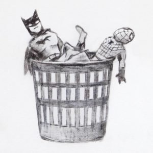 Batman ve Örümcek Adam gibi kurgusal süper kahramanlarsa bir sepetin içine bırakılmış.