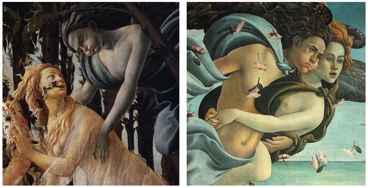 Ayrıca Botticelli, Zephyr ve Chloris’i de her iki eserde resmetmiştir. Primavera’da, çiçekler Chloris’in ağzında dökülürken; Venüs’ün Doğuşu’nda, çiçekler çiftin etrafında uçuşmaktadır.