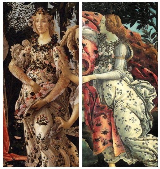 Baharın tanrıçası Flora da, her iki eserde tasvir edilmiştir. Eserlere bakıldığında, çiçek baskılı elbisesi ve çelenk şeklindeki gerdanlığı ile tanınabilir. Primavera‘da kolunun etrafında sarılı olana benzer kırmızı pelerin ile Venüs’ün Doğuşu’nda yeni doğmuş tanrıçayı örtüyor olarak gösterilir.