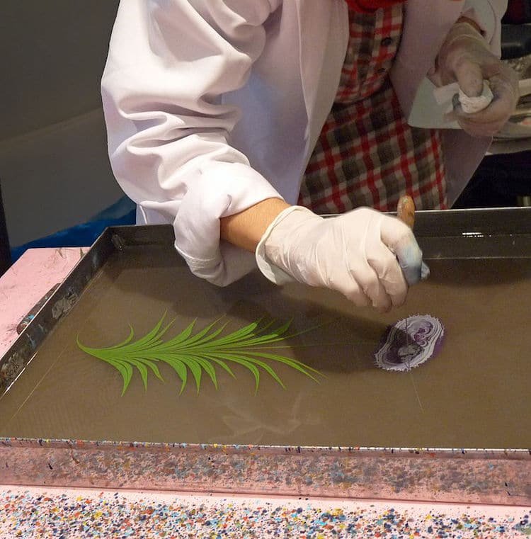 Boya daha sonra yüzeye eklenir, bir selüloz solüsyonunu ve renkleri tasarımlara ve desenlere dönüştürmek için bir tığ kullanılır.
