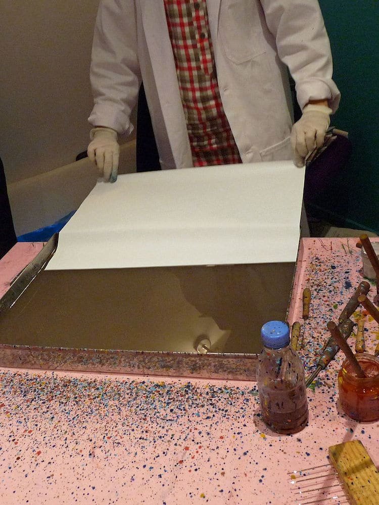 Sanatçı, bu benzersiz “boyama” işlemini tamamladıktan sonra, görüntüyü aktarmak için çalışmasının üstüne dikkatlice bir yaprak kağıt yerleştirir.