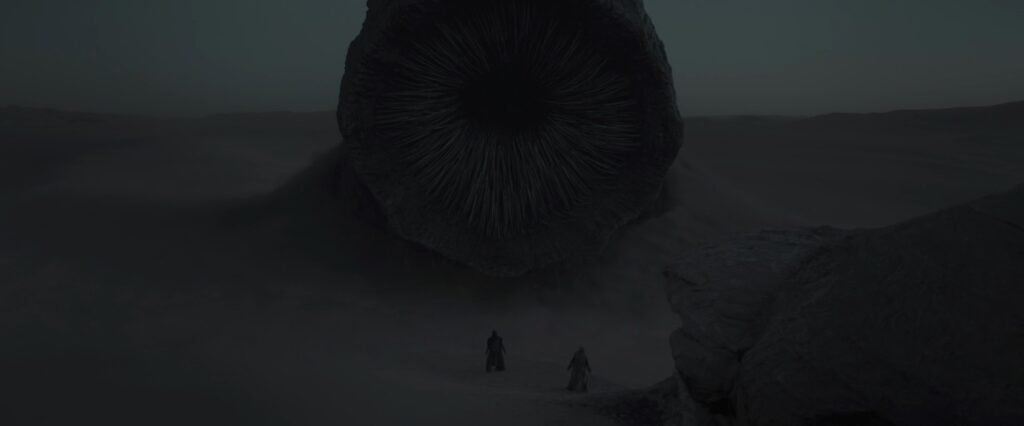 Frank Herbert’ın Dune serisinin imzası olan kum solucanları, Arrakis gezegeninin çöllerinde yaşayan devasa varlıklardır ve solucanlar, bir köpek balığı suda nasıl ilerliyorsa öyle ilerler. Solucanların arazi üzerindeki hakimiyetleri, orada yaşayan toplulukların dönüşümlü olarak saygı görmelerine ve korkmalarına yol açtı. Solucanlar, kumdaki herhangi bir şeye doğru çekilir; çok uzaktan gelen titreşimleri algılayabilir, yeraltından hedeflerine doğru çıkabilir. David Lynch 1984 uyarlamasında, kum solucanlarına canavar çiçekler gibi açılan çok loblu ağızlar verdi. Ancak bu yöntem, Denis Villeneuve’ün kendi ihtişamıyla tekrarladığı bir yaklaşım değil. Herbert’ın kaynak materyaline garip yeni bir bakış getirdi. Villeneuve’ün kum solucanları, gerçekten başka dünyaya aitmiş izlenimini yaratmaya ve bizden farklı bir bağlamdan geldiğini göstermeye çalışır. Paul Atreides, çöle kaçtıktan sonra onlardan biriyle karşılaştığında, solucan devasa kafasını hemen önündeki çukurdan kaldırır ve bu tamamen yabancı yaşam formunun ürkütücü görkemiyle gerilmesi gereken bir anda majesteleri onun görünmeyen yüzüne bakar. Ancak, gölgeli derinliklerinde bir anlığına görünen o gözsüz deliğe bakınca devasa… ne? Ağız? Ya da bir filin hortumunun ucu gibi başka bir açıklık. Her iki durumda da görünüşü, o devasa kıyamet deliğinin etrafındaki ince tüylerin halkasını seçecek kadar yakınında bulunan şanssızlar için gerçek bir sorun yaratır.