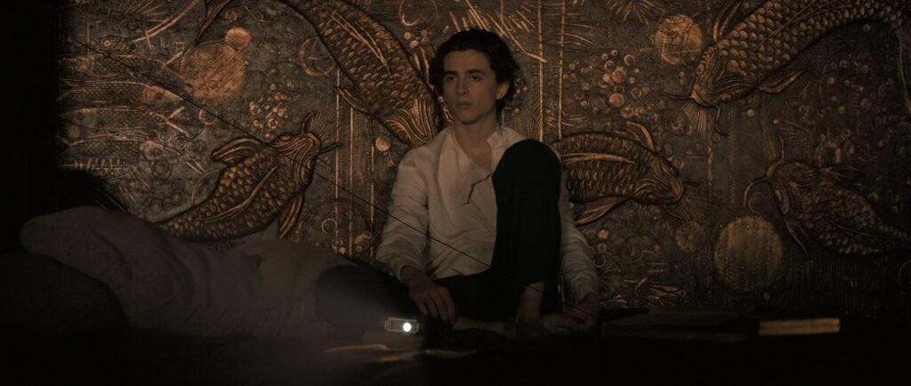 Villeneuve tehlike dolu devasa sahneleri sıralamada ve her doku ve yüzeyin farklılıklarını yücelten dramatik bir anlatıyı ortaya koymada fevkalade bir iş başardı. Hatta belki de Dune‘un ses tasarımı ve partisyonu, önceki filmi Blade Runner 2049‘dan bile daha fazla ilgi çekici. Bu sesler salonda küt küt atıyor, gıcırdıyor ve fısıldıyor. Paul’un özel odasında üzerine doğru uçan bir böceği yani uzaktan kontrol edilen ve onu öldürmeyi amaçlayan bir cihaz olan avcı-arayıcı’yı fark ettiği etkileyici bir sahne var. Bu harekete duyarlı, keskin iğneli hassas küçük obje yaklaştıkça Paul, ani bir hareketinin yerini açığa çıkaracağını bildiği için o can alıcı son ana kadar hareketsiz ve sakin kalmayı başarıyor. Tabii biz de.