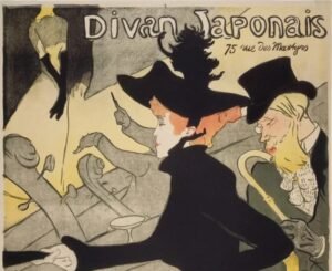 Divan Japonais, dokuzuncu yüzyılın sonlarında Paris’te Toulouse-Lautrec’in uğrak yeri olan birçok kafe-konser yerinden biriydi ve ressam, mekânın reklamını yapmak için aynı ismi taşıyan bir litografi (taş baskı) afişi yapmıştı. Afiş, Toulouse-Lautrec’in kendi zamanının Montmartre’ından üç ünlüyü tasvir eden bir film gibidir.