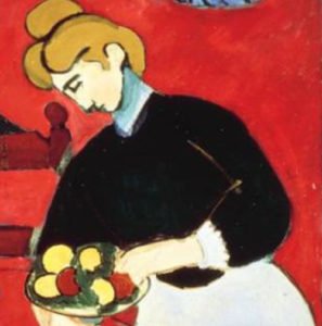 Aslında bu resim, kırmızı rengi ve dağınıklıktan ibaret. Dağınıklık, bizi bunu düzeltmekle görevli olan kişi olan (eserde) hizmetçiye götürür. Bu da eserdeki figürü kıymetli kılar ama yine de odağımızı bu figüre veremeyiz.