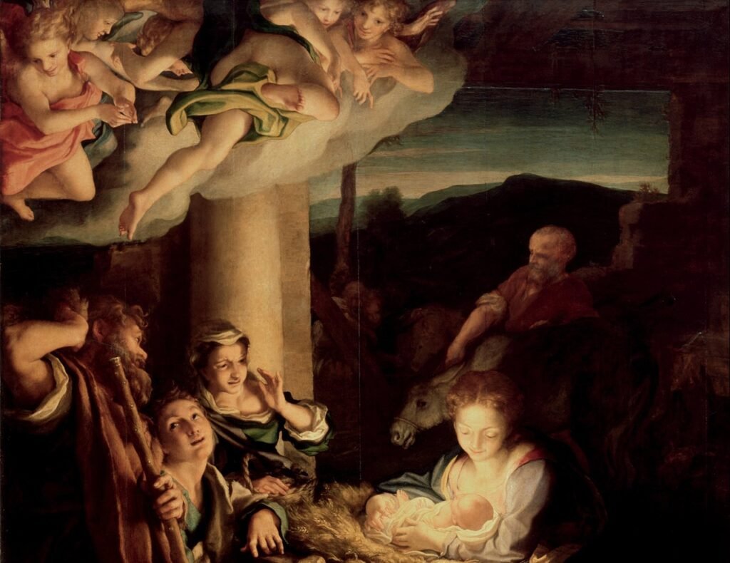 Correggio’nun ‘Doğuş’ veya ‘Çobanların Hayranlığı’ olarak da bilinen Kutsal Gece eseri, 1522 yılında Reggio Emilia’daki St. Prosper kilisesinin aile şapeli için Alberto Pratoneri tarafından sipariş edilmiştir. Avrupa resim sanatında ilk anıtsal gece sahnesi niteliğini taşımaktadır.