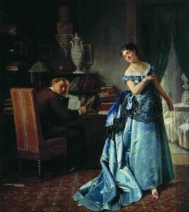 Rus ressam Firs Zhuravlev’in (10 Aralık 1836 – 4 Eylül 1901), günlük hayattan sahneleri gösteren Realist eserleri bize, Rus yaşamının tüm yönlerini göstermektedir. Burada da, bir baloya hazırlanmakta olan moda tutkunu eşini resmetmiştir.