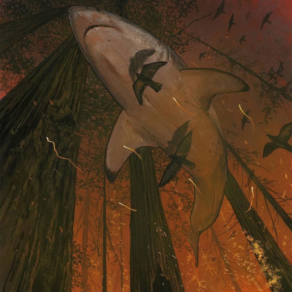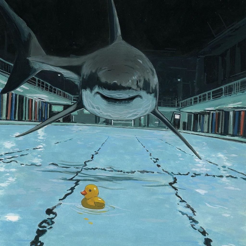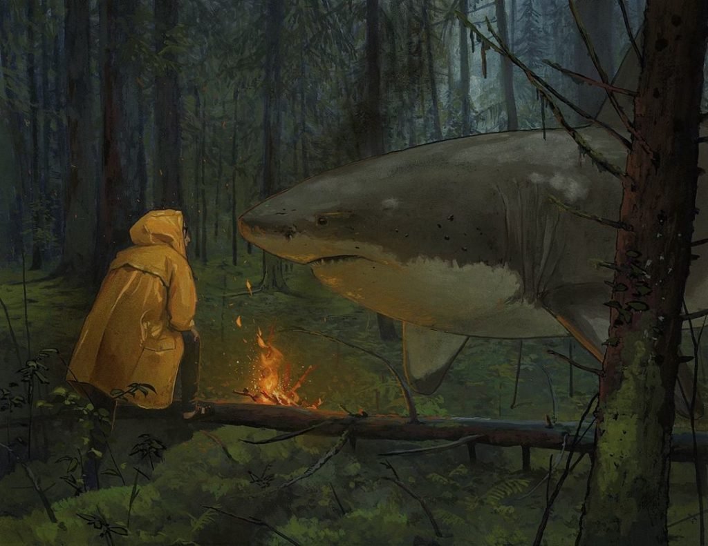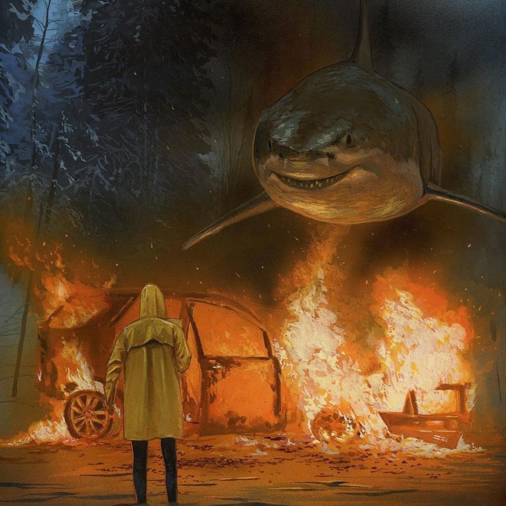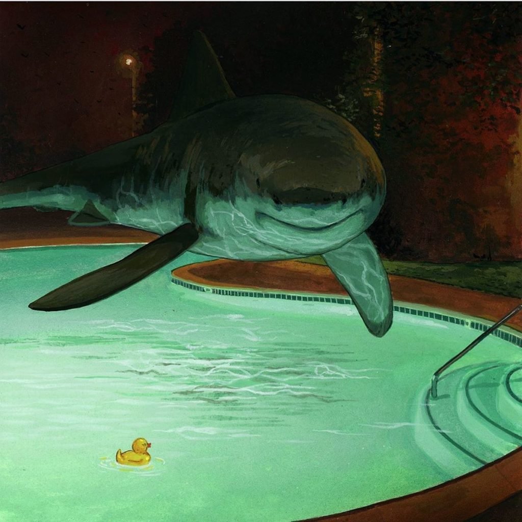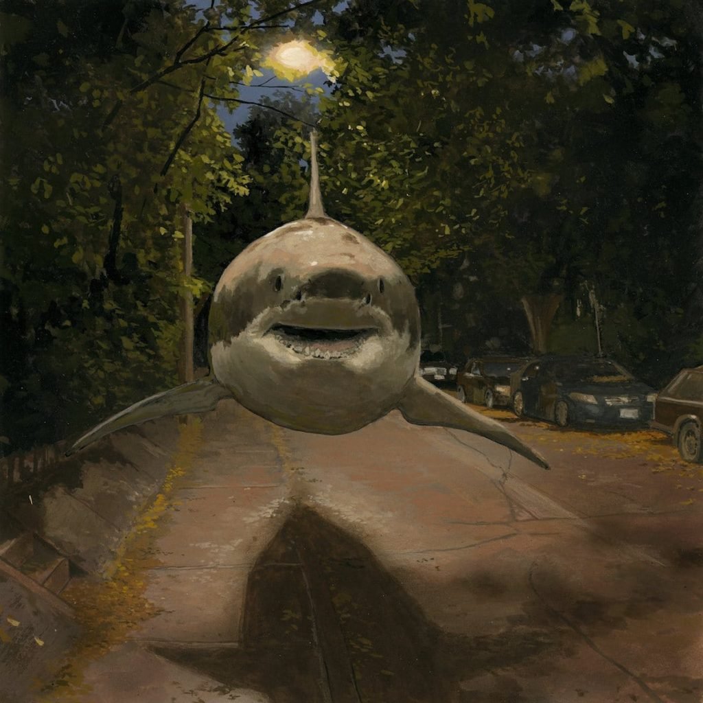 Kanadalı sanatçı en sonki guaj serisinde ışığı okyanusun en korkunç yırtıcı hayvanlarından biri olan köpek balığına çeviriyor. Bu gerçeküstü resimler suyun üzerinde şehirsel ve kırsal manzaralarda gezinen büyük beyazlar ve katil balinaları anlatıyor. Austin ara sıra başka bir figür katmasına rağmen seri ağırlıklı olarak köpek balıklarının havada “yüzerken”ki sessiz gizemine odaklanıyor.
