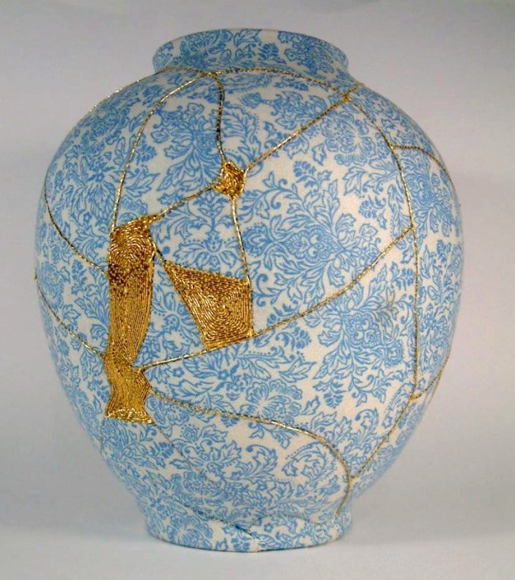 Nakış sanatçısı Charlotte Bailey, kintsugi geleneğine benzersiz bir dokunuşla, desenli kumaşlar ve parlak altın ipliklerle kırık kapları onarıyor.