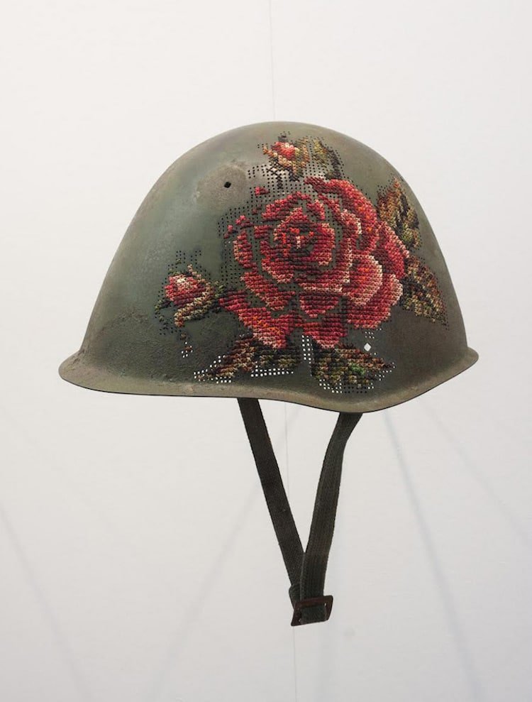 Litvanyalı nakış sanatçısı Severija Incirauskaite-Kriauneviciene, otantik savaş miğferlerinin deliklerine hassas çiçek motiflerini işliyor.