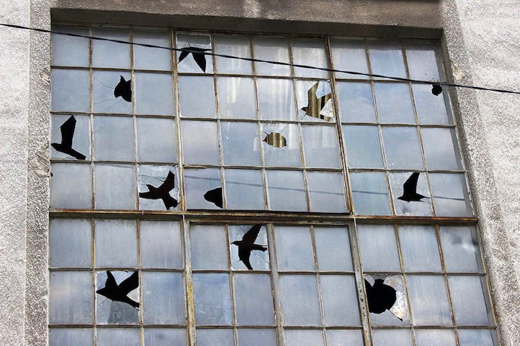 Trompe-l’oeil teknikleriyle tanınan sokak sanatçısı Pejac, sıradan yerleri sanat eserlerine dönüştürüyor. Kamuflaj‘da, uçan kuşların basit siluetlerini oluşturmak için terk edilmiş bir binanın eskimiş camlarını kullanıyor.