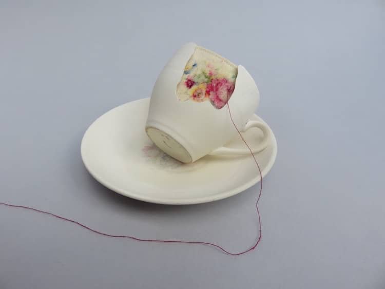 Seramik ve karma medya sanatçısı Michelle Taylor dokunaklı bir tavırla “hatıraları ve varoluşu korumak için hasar görmüş ve kırılmış eserleri onarmaya ve yeniden yaratmaya ihtiyaç duyduğunu” ifade ediyor. Kumaş ve ipek kullanarak, bir kenara atılmış bu çay fincanı gibi, kırık nesneleri zarif bir biçimde onarıyor.
