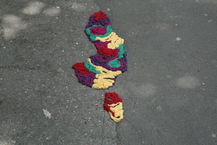 Bölgeye özgü bir proje olan Boulevard de Belleville’de sanatçı Juliana Santacruz Herrera, Paris’in çukurlarını ve kaldırımlarını renkli kumaş şeritlerle onarıyor.