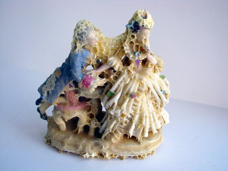 Sanatçı Aganetha Dyck, bit pazarında bulduğu ikinci el heykelcikleri bal petekleri ile süslenmek üzere bal arılarıyla tanıştırarak sanata yeni bir soluk getirmiştir.