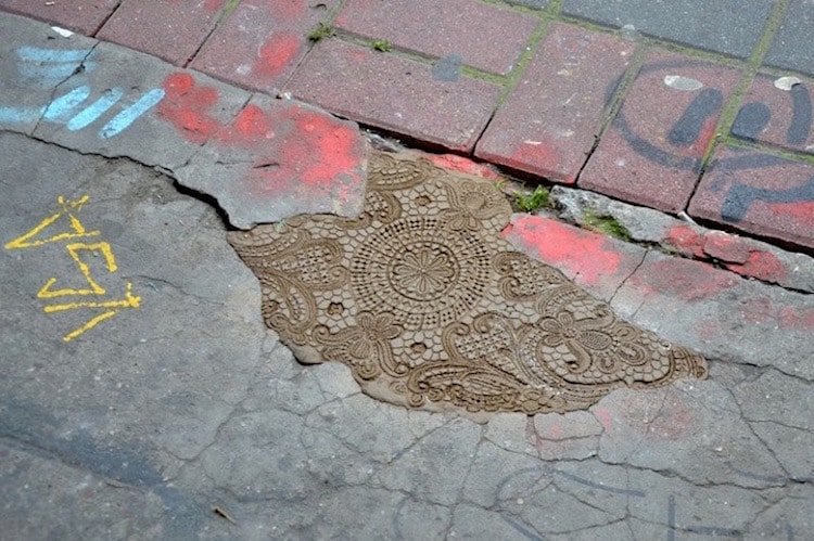 Sokak sanatçısı NeSpoon, zarif dantellerden ilham aldığı desenlerle çatlakları ve delikleri doldurarak kamusal alanları güzelleştiriyor.