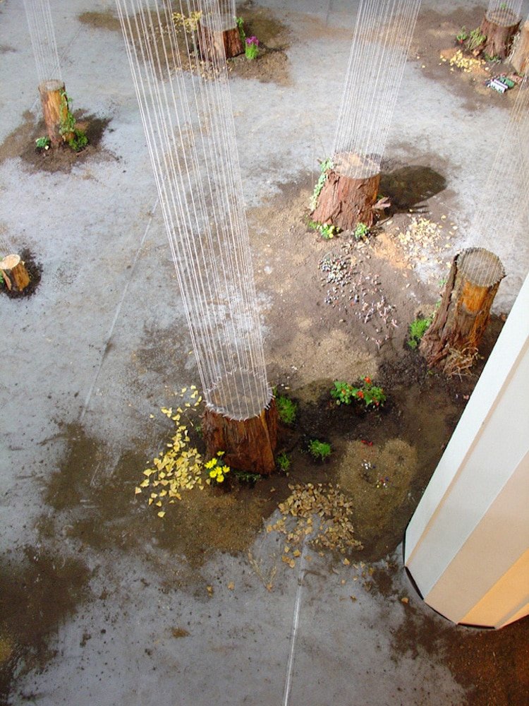 Metamorfoz çalışmasında Keiko Sato, budanmış ağaçlara yeni bir hayat veren hayaletimsi, şeffaf gövdeler oluşturmak amacıyla ağaç kütüklerini iplerle donatmıştır.