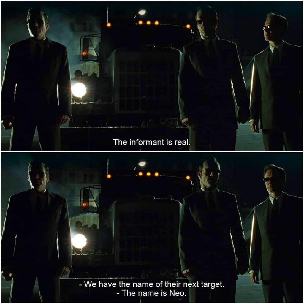 Trinity, meşhur tekmesini atmadan önce Heart of the City Hotel’in 303 numaralı odasında Neo’yu araştırıyordu. Bir sahnede bilgisayarda Neo’nun fotoğrafları görülebiliyor (1.görsel). Trinity, Morpheus’a hattın izlendiğini ama nasıl olduğunu anlamadığını söylüyor. Peki Ajanlar bunu nasıl yaptı? Cevap: Cypher söyledi. Filmin en başında Trinity ile Cypher arasında bir diyalog yaşanıyor (2.görsel). Bu konuşma esnasında Trinity hattın temiz olmadığını anlıyor ve görüşmeyi kapatıyor. Trinity, Matrix’ten çıkmayı başardığında Ajan Smith onun önemli olmadığını söylüyor. Çünkü muhbirleri Cypher’dan yeni hedeflerinin Neo isminde biri olduğu bilgisini almışlardı (3.görsel).