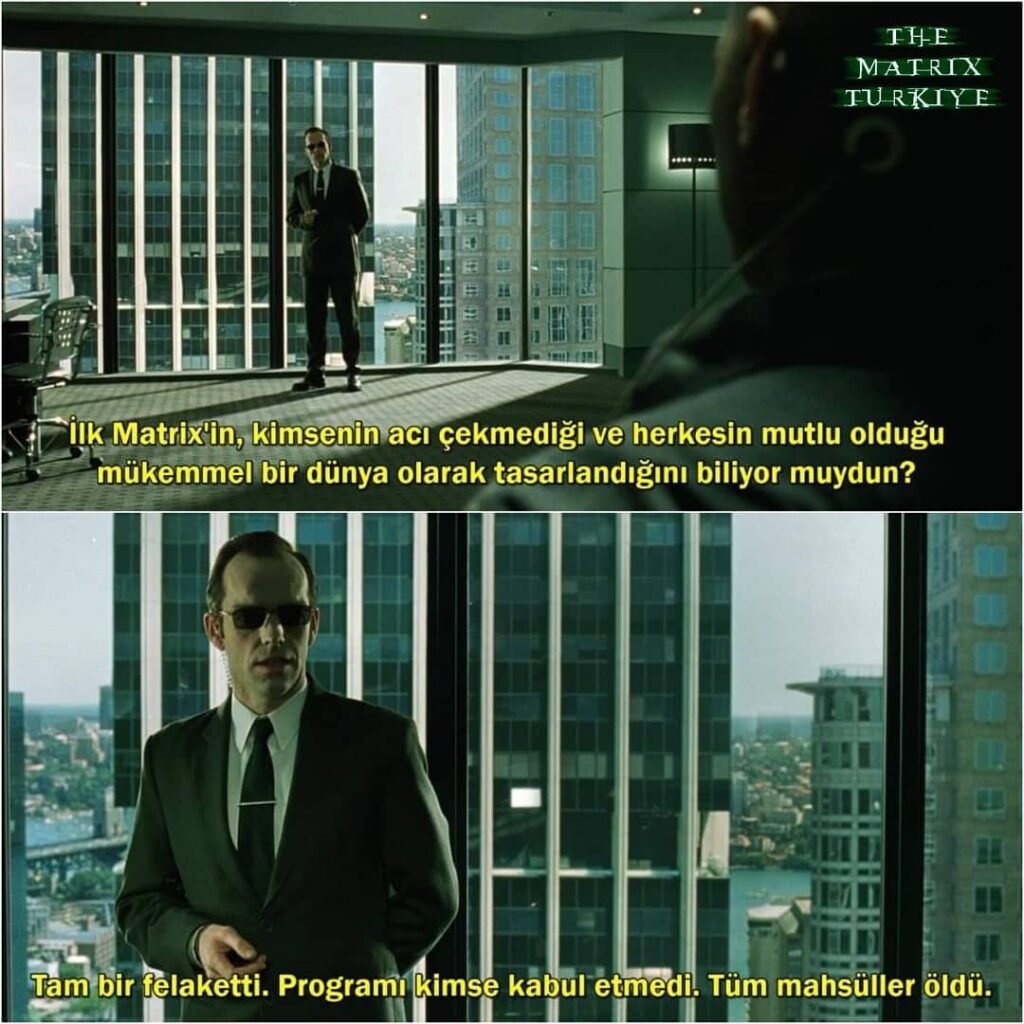 İkinci filmde Mimar da ona yakın cümleler kuruyor. Matrix’i inşa eden kişi olan Mimar, ilk Matrix’in bir sanat eseri olduğunu ama kusurlu insan doğasının onu kabul etmediğini ifade ediyor. Bu kaçınılmazdı çünkü kusurlu bir varlık, mükemmel bir sanat eserini idrak edemezdi.