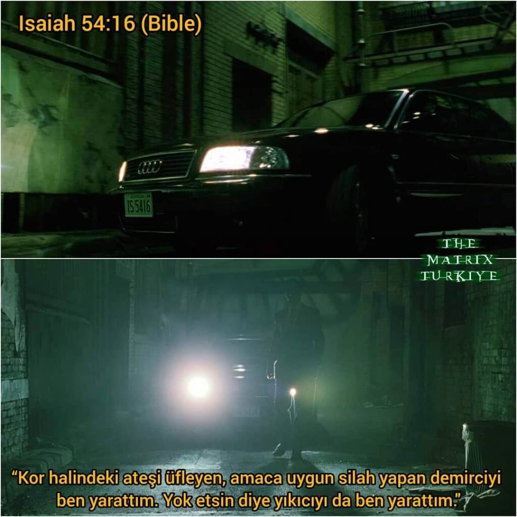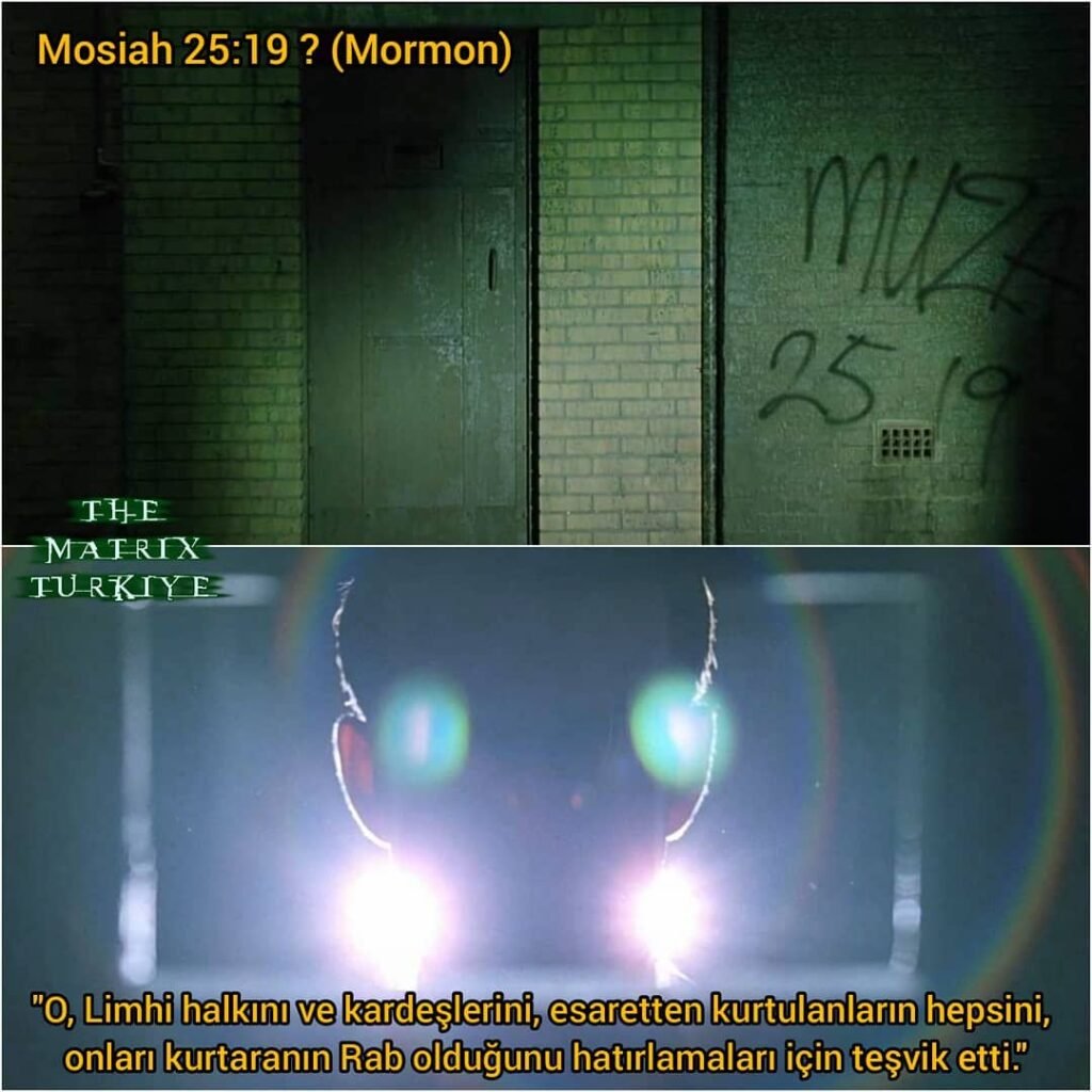 Matrix Reloaded’ın başında Smith, Neo’ya bir hediye vermek için geldiğinde duvarda Muza 25 19 yazıyor. Bu yazı, Mormon kitabının Mosiah 25:19 kısmına bir gönderme olabilir: “O, Limhi halkını ve kardeşlerini, esaretten kurtulanların hepsini, onları kurtaranın Rab olduğunu hatırlamaları için teşvik etti.” Smith bu sahnede ajanların taktığı kulaklığı Neo’ya getirmişti. Onun sayesinde esaretten kurtulduğunun ve özgür olduğunun mesajını vermişti (1. görsel). Smith’in kullandığı arabanın plakası ise IS 5416. Bunun da İncil’deki Isaiah 54:16’ya gönderme olduğunu söyleyebiliriz: “Kor halindeki ateşi üfleyen, amaca uygun silah yapan demirciyi ben yarattım. Yok etsin diye yıkıcıyı da ben yarattım.”