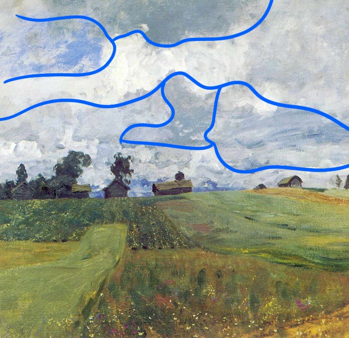 Isaac Levitan’ın Fırtınalı Bir Gün tablosuna bir bakalım. Gökyüzü bulutlarla kaplı. Haliyle belirgin şekiller oluşturmak mümkün değil. Derinlik, üç boyutlu şekiller yerine örtüşen şekillerle verilmiş. Bu nedenle, şekil bütün bu detayları mercek altına almamız için daha kullanışlı olacaktır.