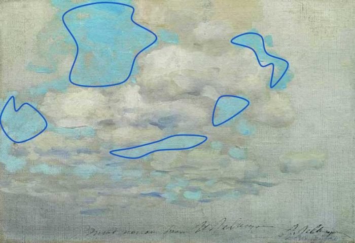 Monet’in İzlenim, Günbatımı çalışmasında bulutlar bir hava katmak için orada, başka hiçbir şey için değil. O kadar az yorum katmış ki bulutlar geri kalan resme cuk oturuyor.