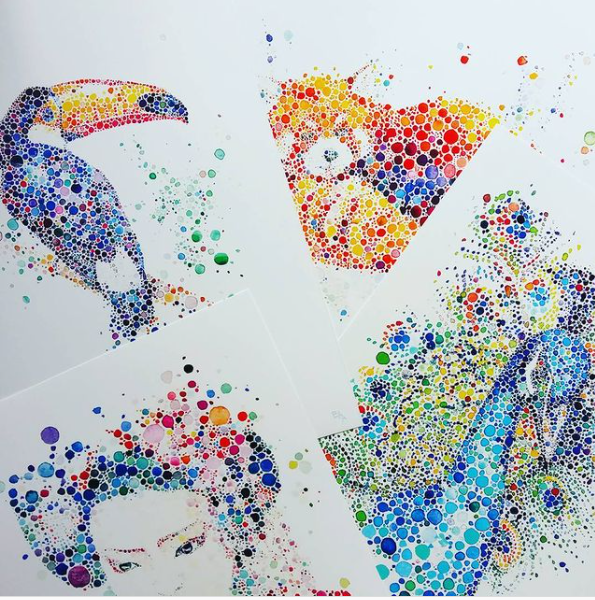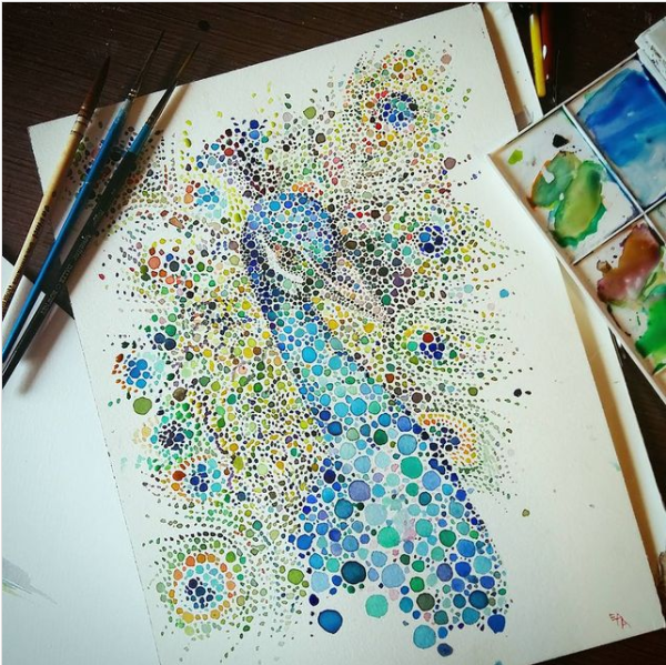Londra’da yaşayan suluboya sanatçısı Ana Enshina, görkemli hayvanları resmetmek için çeşitli şekil ve boyutlarda çok renkli noktalar kullanır. Nokta nokta işlenmiş sanat eserleri, muhteşem bir tavus kuşu, pembe flamingo ve gökkuşağı renginde baykuş gibi çeşitli hayvanlardan oluşur.