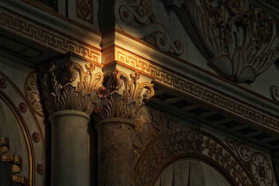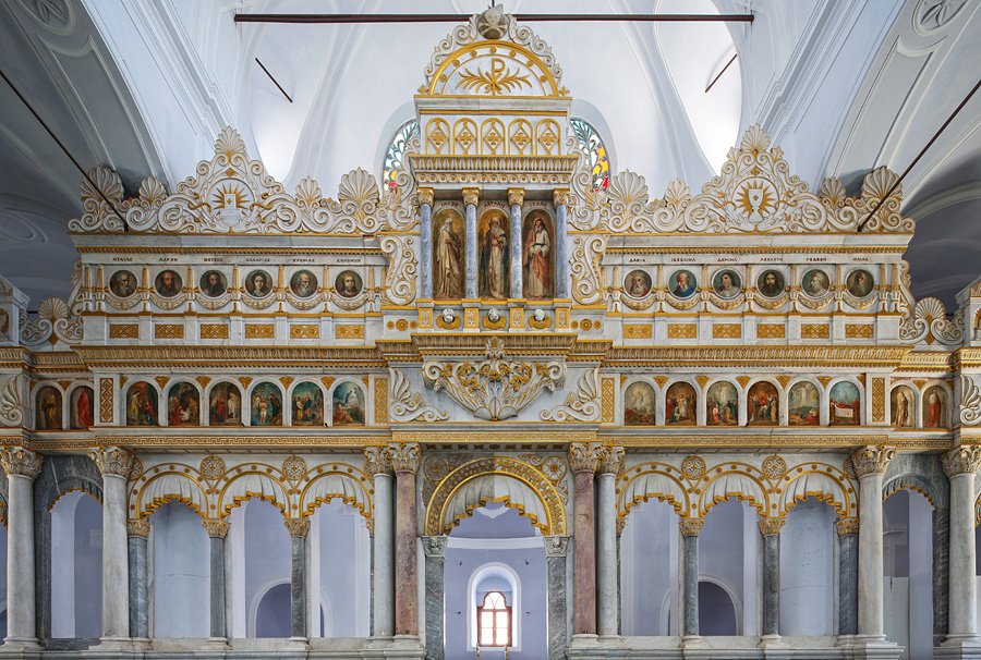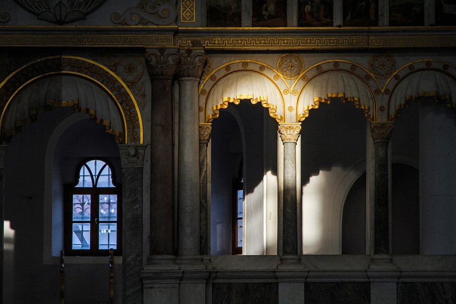 Caminin içine girdiğimizde ise yeşil perdenin ardında karşınıza çıkan ikonaların ihtişamın tanık oluyoruz. Krepis ve stylobata bağlanan sütunlar korint düzen başlıkla sabitlenerek, friz bölümünde ise ikonalar yer almaktadır. Bitkisel motiflerle oluşturulan bezemeler ikonaların etrafını sararken, en üst bölümde siyah beyaz kuru kafa altında bulunan iki kemik yer alırken, bunun Hristiyanlıktaki anlamı ‘ölüm’ olarak sembolize edilmekte olup, ölüm dendiğinde ise “Hz. İsa’nın Çarmıha Gerilişi” ikonasını aklımıza getirmektedir.