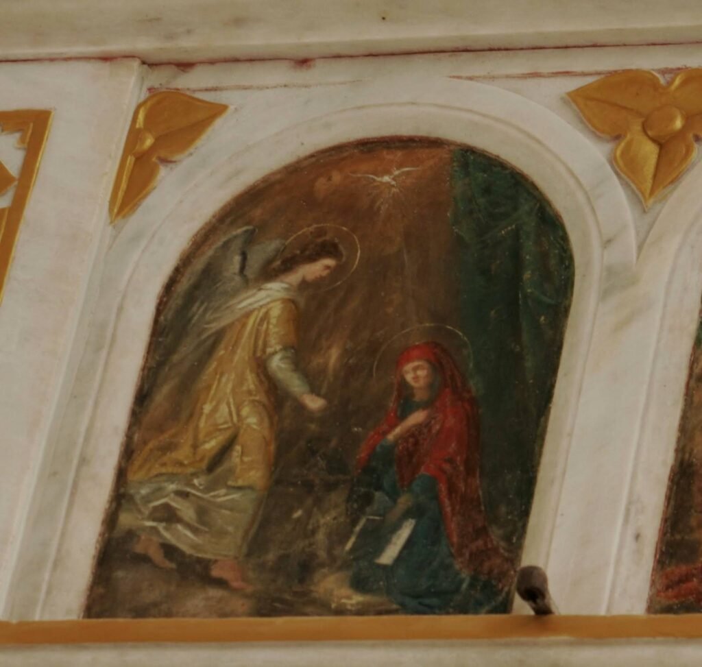 Fresk: Meryem’e Müjde: Meryem bir elini incelikle göğsüne götürürken diğer eliyle de kutsal kitabı tutmaktadır. Üzerinde klasik olarak diğer ikonalarda da gördüğümüz kırmızı ve lacivert kıyafetler bulunmaktadır. Başının üzerinde bulunan hale işareti ise ona kutsallık atfetmektedir. Diğer yandan onun yanına Hz. İsa’nın doğumunun haberini getirecek olan Cebrail, onun ise arka tarafındaki kanatları yine kutsallığın işareti olan halesi dikkat çekmektedir. Meryem’in bu haberi tevazuyla karşıladığı yüz hatlarından da görebilmekteyiz. (Daha ayrıntılı şekilde bu tabloyu Boticelli’nin altar için yapmış olduğu Meryem’e Müjde resmine bakarak da inceleyebilirsiniz.) Arka planın karanlık olması ise figürleri ortaya çıkartmak için kullanılmıştır.