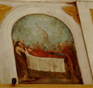 Fresk: Koimesis: Meryem’in Ölümü: Meryem İsa’nın çarmıha gerilmesinden sonra oğlunun hasretine dayanamaz ve kendisinin de oğlunun yanına alınması için Tanrı’ya dua eder. Melek ona ölümünde başucuna dikilmesi için palmiye yaprağı verir. İsa Meryem’i Yahya’ya emanet etmişken bu sefer Meryem’de kendisinin öleceğini
