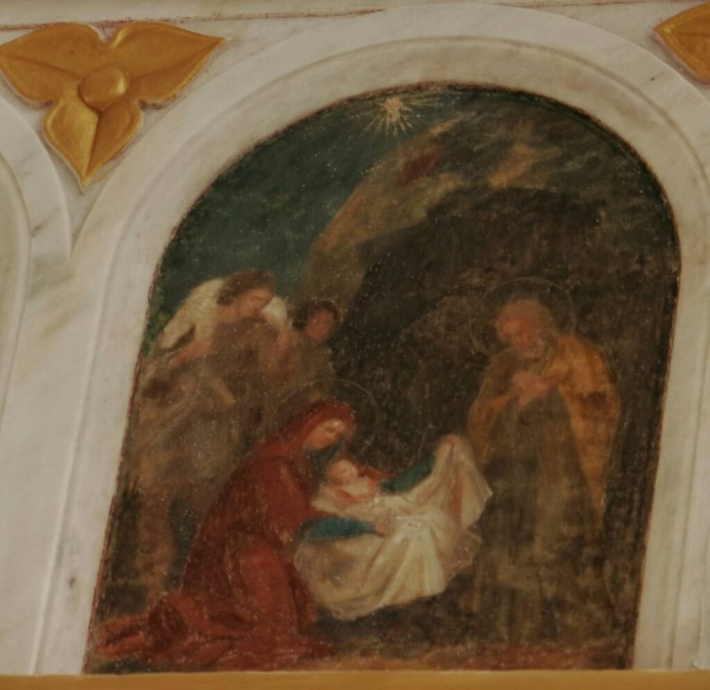 Fresk: İsa’nın Doğumu: Meryem’i bu freskte de kırmızı ve lacivert giysileriyle görmekteyiz. Ama bu sefer beyazlar içinde sarılı olan yeni doğmuş İsa’yı da kucağına almış vaziyette. Yine etraflarında başında haleleri olan melekler onlara eşlik etmekte, Meryem tebessüm ederek çocuk İsa’ya bakıyor. Hz. Yusuf ise sağda yer alan kır saçlı başında halesi bulunan, elleriyle secde işareti yaparak onlara bakmaktadır.