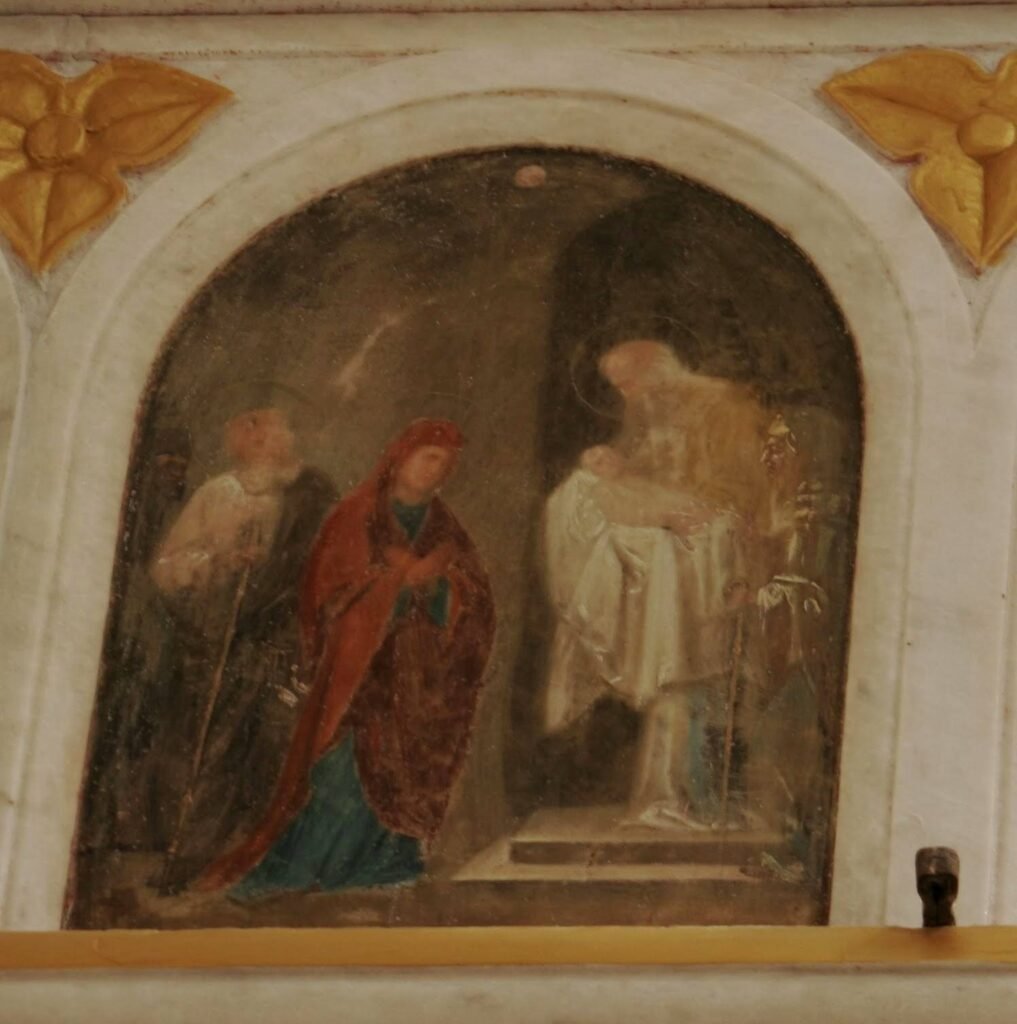 Fresk: İsa’nın Tapınağa Sunulması: Meryem ve Yusuf yan yana, bu sefer ise çocuk İsa tanrıya takdim için Yaruşelem’de, Simeon’nun kucağında durmaktadır. Meryem kırmızı ve lacivert kıyafetlerinin içinde görülürken, kutsal figürlerin başlarında yine hale simgesi dikkat çekmektedir. Meryem başını öne doğru eğerek karakterinin ve ruhsal yasanın getirisi olan bu görevi kabullenmiş görünmektedir. Simeon ise kucağında tuttuğu beyazlar içindeki İsa’nın yüzüne bakmaktadır. Simeon İsa’yı kucağına alarak aynen şöyle dedi: