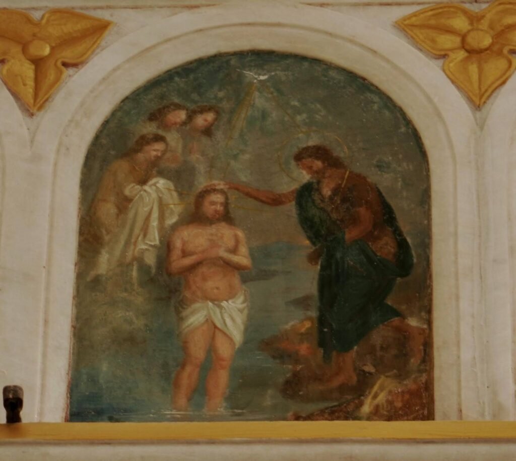 Fresk: İsa’nın Ürdün Irmağı’nda Vaftizi: Vaftizci Yahya, İsa’yı vaftiz ederken İsa’nın kafasının üzerinde yer alan beyaz güvercin “Kutsal Ruh” u temsil etmektedir. İsa’nın sol yanında üç tane melek görünürken ayaklarının altında, nehir resmin arka planında da devam etmektedir. Beyaz güvercin, Vaftizci Yahya’nın elinde tuttuğu kase ve İsa’nın başı üçgen oluşturacak şekilde aynı eksen üzerinde yer almaktadır. Freskte aynı zamanda daha soluk ve mat renklerin hakim olduğunu görmekteyiz. Diğer fresklerde olduğu gibi burada da kutsal kişilerin başında haleleri görüyoruz.
