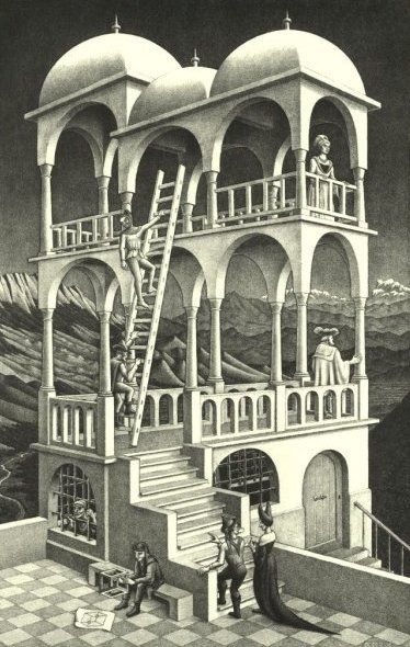 Tablo, Escher’ın en ünlü tablolarından biri olup değişik çeşitlerde yer çekiminin bulunduğu bir dünya sunmaktadır. Bu dünyanın insanları kendi hâllerinde takılır, birçok merdivenden inip çıkarlar.