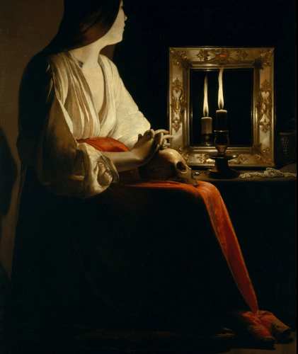 Georges De La Tour’un en sevdiği iki kompozisyonu, bu haftanın tablosu olan Yas Tutan Mary Magdalene‘de görebiliyoruz. İlki mumdur: La Tour’un tablolarında nadiren yer almayan bir unsurdur. Mum, ressamın eserlerinin tanınmasında bir marka hâline gelmiştir. İkinci ise tövbe eden hayat…