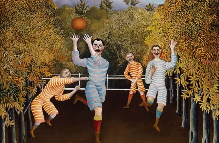 Örnek niteliğinde Naif¹ sanatçı Henri Rousseau’nun (1844-1910) bambaşka dünyasına hoş geldiniz. Onun düşsel, çizgili formalı futbol oyuncuları ile tanışalım. Neredeyse birbirinin aynısı olan dört erkek, çizgili pijamaya benzeyen kıyafetleri ve pala bıyıkları ile büyük ihtimalle Paris’te bir parkta güzel vakit…