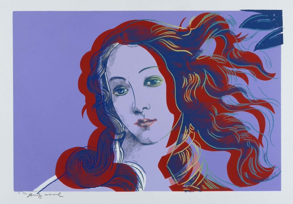 Andy Warhol tarafından Venüs’ün Doğuşu sanatçının Rönesans döneminden şaheserleri aldığı ve bir pop art spin ile birleştirdiği Rönesans portföyünün detayları’nın bir parçasıdır. Botticelli’nin orijinal Venüs eseri tüm vücudu ile ayrıntılı bir arka plana sahip olmasına rağmen, Warhol yüzüne ve akan saçlarına odaklanmayı seçmiştir.
